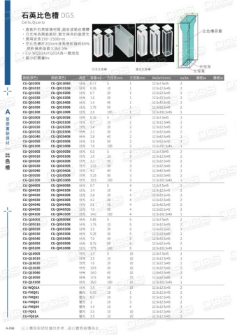 貨號(原色)貨號(黑色)用途容量mL光徑長mm光徑寬mmWxDxH(mm) ea/bx價格bx 價格bx CU-Q01005CU-Q01010CU-Q01020CU-Q01030CU-Q01040CU-Q01050CU-Q01100CU-Q01005BCU-Q01010BCU-Q01020BCU-Q01030BCU-Q01040BCU-Q01050BCU-Q01100B分光分光分光分光分光分光分光0.170.350.71.01.41.753.551020304050100111111112.5x7.5x4512.5x12.5x4512.5x22.5x4512.5x32.5x4512.5x42.5x4512.5x52.5x4512.5x102.5x452222221 CU-Q02005CU-Q02010CU-Q02020CU-Q02030CU-Q02040CU-Q02050CU-Q02100CU-Q02005BCU-Q02010BCU-Q02020BCU-Q02030BCU-Q02040BCU-Q02050BCU-Q02100B分光分光分光分光分光分光分光0.350.71.42.12.83.57.051020304050100222222212.5x7.5x4512.5x12.5x4512.5x22.5x4512.5x32.5x4512.5x42.5x4512.5x52.5x4512.5x102.5x452222221 CU-Q03005CU-Q03010CU-Q03020CU-Q03030CU-Q03040CU-Q03050CU-Q03100CU-Q03005BCU-Q03010BCU-Q03020BCU-Q03030BCU-Q03040BCU-Q03050BCU-Q03100B分光分光分光分光分光分光分光0.51.02.13.154.25.2510.551020304050100333333312.5x7.5x4512.5x12.5x4512.5x22.5x4512.5x32.5x4512.5x42.5x4512.5x52.5x4512.5x102.5x452222221 CU-Q04005CU-Q04010CU-Q04020CU-Q04030CU-Q04040CU-Q04050CU-Q04100CU-Q04005BCU-Q04010BCU-Q04020BCU-Q04030BCU-Q04040BCU-Q04050BCU-Q04100B分光分光分光分光分光分光分光0.71.42.84.25.67.014.051020304050100444444412.5x7.5x4512.5x12.5x4512.5x22.5x4512.5x32.5x4512.5x42.5x4512.5x52.5x4512.5x102.5x452222221 CU-Q05005CU-Q05010CU-Q05020CU-Q05030CU-Q05040CU-Q05050CU-Q05100CU-Q05005BCU-Q05010BCU-Q05020BCU-Q05030BCU-Q05040BCU-Q05050BCU-Q05100B分光分光分光分光分光分光分光0.851.753.55.257.08.7517.551020304050100555555512.5x7.5x4512.5x12.5x4512.5x22.5x4512.5x32.5x4512.5x42.5x4512.5x52.5x4512.5x102.5x452222221 CU-Q10005CU-Q10010CU-Q10020CU-Q10030CU-Q10040CU-Q10050CU-Q10100分光分光分光分光分光分光分光1.73.57.010.514.017.535.0510203040501001010101010101012.5x7.5x4512.5x12.5x4512.5x22.5x4512.5x32.5x4512.5x42.5x4512.5x52.5x4512.5x102.5x452222221 CU-WQ01ACU-FMQ01CU-FMQ02CU-FMQ03CU-FMQ04CU-FQ01CU-FQ01A分光螢光螢光螢光螢光螢光螢光3.50.350.711.43.53.510101010101010101234101012.5x12.5x4512.5x12.5x4512.5x12.5x4512.5x12.5x4512.5x12.5x4512.5x12.5x4512.5x12.5x452222222 石英比色槽 DGSCells,Quartz˙ 遠紫外石英玻璃材質,超音波黏合槽體˙ 分光用為兩面磨砂,螢光用為四面透光˙ 適用波長190~2500nm˙ 空比色槽於200nm波長透射值約80% ,絕對偏差值最大為0.5%˙ CU-WQ01A/FQ01A為一體成型˙ 最小訂購量bxHHw wDD比色槽容量光徑寬光徑長螢光比色槽分光比色槽A基礎實驗器材以上價格與規格僅供參考 , 請以實際報價為主A-098比色槽