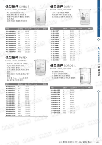 貨號容量mLØxH(mm)ea/bx/cs價格eaAK14000-00010AK14000-00020AK14000-00100AK14000-00150AK14000-00400AK14000-00600AK14000-00800AK14000-01000AK14000-01500AK14000-02000AK14000-040001020100150400600800100015002000400025x3232x4050x7157x7977x10688x12298x136107x145120x165130x190161x25012/412/412/412/412/46/66/46/44/44/21/6低型燒杯 KIMBLEBeaker, Griffin, Low Form˙KG-33硼矽酸玻璃製成˙刻度清晰,標示區易寫耐用˙ 壁厚均勻,並具有優良之傾倒功能不滴漏˙適用於混合或量測液態樣本貨號容量mLØxH(mm)ea/bx價格eaAS1000-00005AS1000-00010AS1000-00025AS1000-00050AS1000-00100AS1000-00150AS1000-00250AS1000-00400AS1000-00600AS1000-00800AS1000-01000AS1000-02000AS1000-03000AS1000-05000AS1000-10000510255010015025040060080010002000300050001000022x3026x3534x5042x6050x7060x8070x9580x11090x125100x135105x145130x185150x210170x270217x350101010101010101010101010411低型燒杯 PYREXBeaker, Griffin, Low Form˙符合ISO 3819和DIN 12331˙Pyrex 硼矽酸玻璃製成˙白色刻度及書寫區˙良好的散熱性能及高抗化學侵蝕性˙玻璃瓶身印有產品追溯碼,可下載批 次證書 (5mL、10mL無追溯碼,僅可提供材質證明)貨號容量mLØxH(mm)ea/bx價格eaBS-2110607BS-2110608BS-2110614BS-2110617BS-2110624BS-2110629BS-2110636BS-2110641BS-2110648BS-2110653BS-2110654BS-2110663BS-2110668BS-2110673BS-2110686510255010015025040060080010002000300050001000022x3026x3534x5042x6050x7060x8070x9580x11090x125100x135105x145132x185152x210170x270217x350101010101010101010101010411低型燒杯 DURANBeaker, Griffin, Low Form˙DURAN硼矽酸玻璃材質˙刻度清晰,標示區易寫耐用˙適用於混合或量測液態樣本貨號容量mlODxH(mm)價格eaABO-1001006ABO-1001008ABO-1001010ABO-1001D12ABO-1001D16ABO-1001D18ABO-1001D21ABO-1001D23ABO-1001D25ABO-1001D28ABO-1001D29ABO-1001D30102030501001502504006008001000200025x3532x4235x5042x6050x7056x8570x9577x11090x125100x135105x145130x185低型燒杯 BOROSILBeaker, Griffin, Low Form˙硼矽酸玻璃製成˙符合ASTM E960規範˙白色雙刻度印刷及書寫區˙良好的散熱性能及抗化學侵蝕性A基礎實驗器材以上價格與規格僅供參考 , 請以實際報價為主A-003以上價格與規格僅供參考, 請以實際報價為主玻璃燒杯