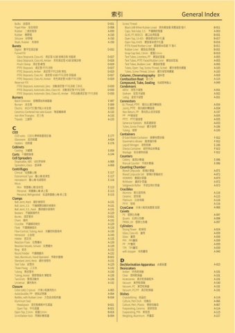 索引General Index Bulbs 送風球 Pipet Filler 安全吸球 Rubber 二連送風球 Rubber 橡膠帽 Silicone 矽膠帽 Wash, Rubber 洗滌球Burets Digital 數字型滴定器 Funnel Fill Glass Stopcock, Class AS 滴定管 AS級 玻璃活栓 背藍線 Glass Stopcock, Class AS, Amber 茶色滴定管 AS級 玻璃活栓 Pinch Clamp 滴定管 鹼性 PTFE Stopcock 滴定管 PTFE活栓 PTFE Stopcock, Amber 滴定管 PTFE活栓 茶色 PTFE Stopcock, Class AS 滴定管 AS級 PTFE活栓 背藍線 PTFE Stopcock, Class AS, Amber 茶色滴定管 AS級 PTFE活栓 Reservoir Fill PTFE Stopcock, Automatic Zero 自動滴定管 PTFE活栓 三斜孔 PTFE Stopcock, Automatic Zero, Class AS 自動滴定管 PTFE活栓 PTFE Stopcock, Automatic Zero, Class AS, Amber 茶色自動滴定管 PTFE活栓 Burners Bacti-Cinerator 接種環加熱滅菌器 Bunsen 本生燈 Electric WLD-TEC電子點火本生燈 Ceramics Centered Iron wire Gauze 陶瓷纖維網 Iron Wire Triangles 泥三角 Tripods 三腳架CCOD COD vario COD化學需氧量測定儀 Glassware 迴流裝置 Heaters 加熱爐Cabinets Cooling 冷藏櫃Carts 不鏽鋼推車 Cell Spreaders Disposable, ABS ABS塗抹棒 Spreaders, Glass 塗抹棒Centrifuges Clinical 低速離心機 Economical Type 離心機 經濟型 Hematocrit 離心機 毛細管用 Micro Mini 微量離心機 迷你型 Personal 微量離心機 桌上型 Personal, Refrigerated 低溫微量離心機 桌上型Clamps Ball Joint, Keck 磨砂接頭夾 Ball Joint, S.S. 不鏽鋼圓球磨砂接頭夾 Ball Joint, S.S., Keck 圓球磨砂接頭夾 Beakers 不鏽鋼燒杯夾 Burets 滴定管夾 Chain 鏈夾 Crucible 不鏽鋼坩堝夾 Flask 不鏽鋼燒瓶夾 Flow Control, Tubing, Keck 流量控制管路夾 Hemostat 止血鉗 Holder 固定夾 Reaction Flask 反應槽夾 Reaction Vessels, Schoot 反應槽夾 Ring 束夾 Round Holder 不鏽鋼圓夾 Seal, Aluminum, Hand Operated 手動封蓋機 Standard Joint, Keck 磨砂接頭夾 Test Tube 試管夾 Three Prong 三叉夾 Tubing 橡皮管夾 Tubing, Acetal 塑膠管路夾 薄管用 Two Ends 雙頭活動夾 Universal 廣用角夾Closure Color cold, Cryovial 冷凍小瓶蓋用色片 Autoclavable, PP 透氣試管蓋 Bottles, with Rubber Liner 方型血清瓶用蓋 Aluminum Seal Headspace 頂空取樣瓶中孔鋁蓋 Open Top 中孔鋁蓋 Open Top, 11mm 鋁蓋11mm Scintillation Vails 閃爍計數瓶蓋 Screw Thread Black 14B White Rubber Lined 黑色螺旋蓋 高壓滅菌 墊片 Caps, Test tube, S.S. 不鏽鋼試管蓋 GL45, PP, BOECO 廣口血清瓶蓋 Open Top, 13-425 螺旋樣本瓶中孔蓋 Open Top, 8-425 螺旋樣本瓶中孔蓋 PTFE-Faced Rubber Liner 螺旋樣本瓶蓋 TF 墊片 Rubber Liner 螺旋血清瓶蓋 Snap Cap Seal, 11mm 壓蓋11mm Test Tubes, Linerless, PP 螺旋試管蓋 Test Tubes, PTFE-Faced Rubber Liner 螺旋試管蓋 Test Tubes, Rubber Liner 螺旋試管蓋 Tubes, Open -Top, Screw Thread, Schott 螺牙接管用螺蓋 Tubes, Screw Thread, Schott 螺牙接管用螺蓋Column, Chromatography 層析管Combustion Boat 瓷小舟Compound, Tube, Sealing 毛細管用黏土Condensers Allihn 球型冷凝管 Graham 蛇型冷凝管 Liebig 直型冷凝管 Connectors GL Thread, PTFE 萬向GL螺牙轉接頭 Joints, PTFE 萬向磨砂轉接頭 Non-Return, PP 單向防止逆流接管 PP PP連接管 PTFE PTFE連接管 Spherical Kjeldahl 氮氣連接球 Tubes, Screw Thread 螺牙接管 Tubing 接管Containers β-Gard Waste Container 廢棄物置放箱 Gravimetric dilutor 廢液儲存桶 Liquid Nitrogen 液態氮桶 Sharps Container 銳利物品收集盒 Wastage 安全廢物容器Counters Colony 菌落計數器 Manual Counter 手按計數器 Counting Chamber Blood Corpuscle 玻璃計算盤 Blood Corpuscle Set 玻璃計算盤組合 HOWARD 黴菌計算盤 McMaster 蟲卵計算盤 Sedgewick Rafter 浮游生物計算盤Crucibles Alumina 氧化鋁坩堝 Ceramic 瓷坩堝 Platinum 白金坩鍋 PTFE 坩堝 CryoCane 冷凍小瓶用放置管 鋁質Cuvets PS 塑膠比色槽 Quartz 石英比色槽 PMMA, UV 塑膠比色槽Cylinders Drying Tower 乾燥塔 Glass, Class AS 量筒 Glass 量筒 PFA PFA量筒 PP PP量筒 TPX TPX量筒 with stopper 有栓量筒DDechlorination Apparatus 去氯裝置Desiccators Amber 茶色乾燥器 Clear 透明乾燥器 Accessories 真空乾燥器配件 Vacuum 真空乾燥器 Vacuum, PC 真空乾燥器 Vacuum, PC/PP 真空乾燥器 Dishes Cryastallizing 結晶皿 Culture, Petri Dish 培養皿 Culture, Petri, Plastic 塑膠培養皿 Evaporating, Ceramic 瓷蒸發皿 Evaporating, PFA 蒸發皿 Weighing, Aluminum 秤量皿D-031D-008A-030A-150A-150A-150D-032D-027D-028D-029D-027D-029D-027D-029D-030D-030D-030E-007E-009E-009A-133A-133A-133E-177A-024E-178E-058A-144A-068A-068E-117E-117E-116E-113E-113E-115A-131A-131A-131A-129D-031A-132A-129A-129A-130A-143A-135A-129A-129A-132A-132B-022A-131A-129A-132A-130A-130A-136A-132A-065A-054B-034B-021B-021B-018B-004B-011A-053B-031B-017B-016B-011B-031B-019A-055A-055A-055A-163A-163A-029A-115A-049A-031A-032A-031A-034A-034A-107A-035A-035A-033A-106A-105F-022F-022E-166F-022F-022E-096E-096A-071A-072A-073A-072A-073A-116A-115A-116A-116A-066A-097A-098A-097A-024A-039A-039A-039A-039A-039A-040A-023A-101A-101A-101A-100A-101A-101A-114A-066A-067A-114A-115A-157