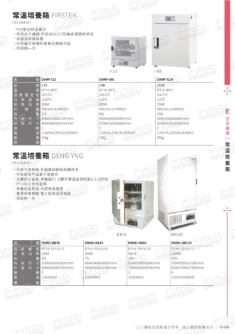 常溫培養箱 FIRSTEKIncubator˙PID數位控溫顯示˙內部為不鏽鋼,外部為SECC防鏽處理鋼板烤漆˙具過溫保護裝置˙計時器可做預約開機及關機功能˙保固期一年貨號D9MF-I23D9MF-I80D9MF-I150型號溫度溫度穩定性分佈溫度加熱功率計時器容量內部尺寸外部尺寸層數電源重量價格I-23R.T+5~80℃±0.1℃±0.5℃300W999/min or 9999/hr23L350Wx250Dx270H/mm450Wx445Dx470H/mm1110V/5A,220V/3A,50/60HZ22kgI-80R.T+5~80℃±0.1℃±2℃600W999/min or 9999/hr80L400Wx400Dx500H/mm570Wx530Dx830H/mm2110V/6A,220V/3A,50/60HZ70kgI-150R.T+5~80℃±0.1℃±2℃700W999/min or 9999/hr150L500Wx500Dx600H/mm670Wx630Dx925H/mm2110V/7A,220V/4A,50/60HZ90kgI-80I-23常溫培養箱 DENG YNGIncubator˙內部不銹鋼板,外箱鍍鋅鋼板粉體烤漆˙內有透視門溫度不易散失˙ 全觸控式面板,微電腦P.I.D雙字幕溫度控制器S.S.R控制˙ PT100白金測溫棒˙ 長軸送風馬達,內部微風循環˙ 電源保護開關,獨立超高溫保護器˙保固期一年貨號D9MD-DB30D9MD-DB45D9MD-DB60D9MD-DB120溫度範圍加熱功率容量內部尺寸外部尺寸層數電源價格R.T+5~70±0.1℃180W30L320Wx300Dx300H/mm450Wx450Dx700H/mm2110V/60HZR.T+5~70±0.1℃250W72L450Wx400Dx400H/mm560Wx550Dx740H/mm2110V/60HZR.T+5~70±0.1℃400 W150L600Wx500Dx500H/mm730Wx650Dx970H/mm2110V/60HZR.T+5~70±0.1℃1200W420L700Wx500Dx1200H/mm810Wx720Dx1750H/mm5110V/220V/60HZDB45DB120E泛用儀器以上價格與規格僅供參考 , 請以實際報價為主E-059常溫培養箱