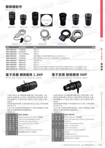 顯微鏡配件Microscope 貨號適用顯微鏡描述 價格DB2C-MB101E1DB2C-MB101E2DB2C-MB111E8DB2C-MF101E2DB2C-MS621L5生物顯微鏡生物顯微鏡生物,金相顯微鏡生物顯微鏡生物顯微鏡目鏡 10X目鏡 15X目鏡 20X目鏡測微器 10X目鏡用 量測長度10mm,刻度0.1mm載物台測微器 76Lx25.5W/mm, 量測長度1mm,刻度0.01mmDB2C-MS621E1DB2C-MS351E2DB2C-MS351E4DB2C-MS621L6DB2C-MS621L10實體顯微鏡實體顯微鏡實體顯微鏡實體顯微鏡實體顯微鏡刻度目鏡 10X目鏡 10X目鏡 20X環型燈 LED光源 56顆LED 無段調光 35000流明(lux),燈罩內徑64mm,4.5W,電壓100-240V環型燈 LED光源 60顆LED 8段調光 四象限方向選擇,燈罩內徑60mm,4.8W,電壓100-240V MB101E1 MB101E2 MB111E8 MF101E2 MS621E1 MS351E2 MS351E4 MS621L4 MS621L31MS621L10MS621L6電子目鏡 顯微鏡用 1.3MPMicroscope, Accessories, Eyepiece, Digital貨號DB2C-AM4025最高畫素畫素選擇影片速率適用口徑傳輸介面重量尺寸作業系統附件價格1280x1024pixels,up to 30fps 130萬畫素1280x1024,640x480(高速),640x4801280x960,15fps/640x480,30fps23mm,30mm,30.5mm,C-MOUNTUSB2.0100g;Ø32x48H/mmWindows7,8,10,XP,VISTA,MAC OS X以上原廠軟體光碟,校正片,收納袋˙ 可廣泛應用於各式顯微鏡(實體,複式,單眼,雙眼,三眼)˙ 高解析度攝影機,USB輸出,搭配軟體可拍照錄影,存檔˙ 具有繁體中文介面並支援27國語言,便於本國與外籍人員操作˙透過原廠應用軟體,可使用量測與校正功能,方便各種後製作業工作˙USB介面,可輕鬆取得影像與影片,儲存至電腦進行後製˙搭配部分顯微鏡時需加購轉接管˙ 保固期1年電子目鏡 顯微鏡用 5MPMicroscope, Accessories, Eyepiece, Digital貨號DB2C-AM7025最高畫素畫素選擇影片速率適用口徑傳輸介面重量尺寸作業系統附件價格2592x1944pixels 500萬劃數2592x1944,2048x1536,1600x1200,1280x960,640x480(VGA)10fps in 5MP/3MP/2MP,MJPEG25fps in 1.3MP,MJPEG30fps in VGA,MJPEG23mm,30mm,30.5mm,C-MOUNTUSB2.0117g;Ø32x80H/mmWindows7,8,10,XP,VISTA,MAC OS X以上原廠光碟,校正片,收納袋˙ 可廣泛應用於各式顯微鏡(實體,複式,單眼,雙眼,三眼)˙ 高解析度攝影機,USB輸出,搭配軟體可拍照錄影,存檔˙ 具有繁體中文介面並支援27國語言,便於本國與外籍人員操作˙透過原廠應用軟體,可使用量測與校正功能,方便各種後製作業工作˙USB介面,可輕鬆取得影像與影片,儲存至電腦進行後製˙搭配部分顯微鏡時需加購轉接管˙ 保固期1年E泛用儀器以上價格與規格僅供參考 , 請以實際報價為主E-291顯微鏡