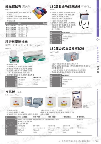 纖維擦拭布 潔美利Wipers˙ 極超細纖維材質,免清潔劑,沾水即可清潔˙不掉棉絮,壽命比棉質纖維更長˙超強吸油吸水力,可吸取本身重量七倍的液體貨號描述價格eaD4EK-J1201-01D4EK-J1201-03D4EK-J1201-08D4EK-J1202-02D4EK-J1202-07D4EK-J1202-10300x320mm 藍300x320mm 磚紅300x320mm 粉紅400x400mm 咖啡400x400mm 灰400x400mm 黃精密科學擦拭紙KIMTECH SCIENCE KimwipesWipers貨號D4EK-34155D4EK-34256尺寸張數包裝價格110x213mm280ea/bx60bx/cs360x428mm140ea/bx15bx/cs˙原生紙漿材質˙吸水性極佳,可輕易拭去液體及塵屑˙專業設計與製程控制,減少紙張發塵˙濕強度高,潤濕後不易刮傷產品表面˙一次一抽,控制使用量,避免浪費˙抗靜電防塵窗口設計,避免灰塵及靜電擦拭紙 LICKLaboratory Wiper˙無紙屑,無靜電 ˙具親水性及吸油性,不易破損˙可控制使用量減少浪費 ˙規格多,用途廣,可搭配掛架使用,不弄髒不污染˙紙捲掛架,適合任何的捲筒紙強韌不易損壞 ˙最小訂購量1cs貨號D4EK-A250882D4EK-7207D4EK-260280D4EK-260282D4EK-0001用途水類.污洉.乾拭.儀器.機 機械裝配.噴漆.印刷.化學儀器.吸油吸水.擦手械裝配.汽車零件.玻璃.石化.研磨.擦手紙捲掛架材質尺寸長度包裝價格100%純木漿23cm(±1cm)約176m/捲2ea/cs熱熔不織布32cmx25cm(±1cm)約160m/捲2ea/cs100%純木漿25.5cm(±1cm)單層約794m/捲2ea/cs100%純木漿23cm(±1cm)雙層約637m/捲2ea/cs鐵450x50x920mm1ea/cs紙捲掛架(不含擦拭紙)L10超長全功能擦拭紙 WYPALLWipers˙長度超長,可提供長時間使用降低換紙率;濕強度高,不易破裂,輕壓花設計,紙質柔軟有質感˙無裁切線,可依工作需求裁切˙不含切割立架,需另購˙適用場所:工廠生產線,工廠維修部,汽車製造,零件生產製造,工具維修,食品加工,工廠保養,汽車保養˙最小訂購量1cs貨號D4EK-65100材質尺寸張數包裝價格紙260mmx1000m1000m/捲2捲/cs˙食品與餐飲服務的最佳擦拭解決方案˙專為輕型擦拭需求而設計,適用於清潔食物表面和擦拭工作檯面等情境˙一次性使用,輕微擦拭用過即丟,能減少交互汙染˙通過嚴謹的國際食品級認證,可與食物直接接觸貨號D4EK-6223材質尺寸張數包裝價格紙380mmx185mm430張/捲6捲/csL10座台式食品級擦拭紙 WYPALLWipersF-005F工安無塵設備以上價格與規格僅供參考 , 請以實際報價為主擦拭紙