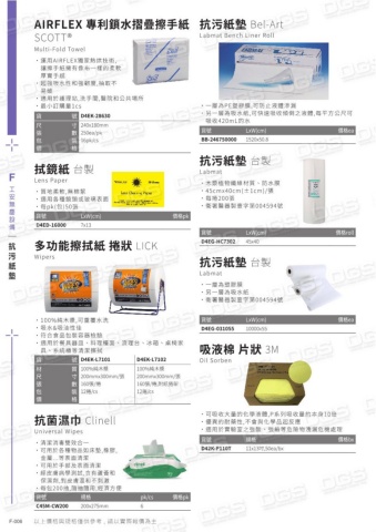 貨號D4EK-28630尺寸張數包裝價格240x180mm250ea/pk16pk/csAIRFLEX 專利鎖水摺疊擦手紙SCOTT®Multi-Fold Towel˙ 運用AIRFLEX獨家熱烘技術,讓擦手紙擁有像布一樣的柔軟厚實手感˙超強吸水性和強韌度,抽取不易破˙適用於護理站,洗手間,醫院和公共場所˙最小訂購量1cs拭鏡紙 台製Lens Paper˙質地柔軟,無棉絮˙適用各種鏡頭或玻璃表面˙每pk(包)50張貨號LxW(cm)價格pkD4ED-160007x13多功能擦拭紙 捲狀 LICKWipers貨號D4EK-L7101D4EK-L7102材質尺寸張數包裝價格100%純木漿200mmx300mm/張160張/捲12捲/cs100%純木漿200mmx300mm/張160張/捲,附紙捲架12捲/cs˙100%純木漿,可重覆水洗˙吸水&吸油性佳˙符合食品包裝容器檢驗˙適用於餐具器皿、料理檯面、流理台、冰箱、桌椅家具、系統櫃等清潔擦拭抗菌濕巾 ClinellUniversal Wipes˙清潔消毒雙效合一˙可用於各種物品如床墊,橡膠,金屬...等表面清潔˙可用於手部及表面清潔˙經皮膚病學測試,含有蘆薈和保濕劑,對皮膚溫和不刺激˙每包200抽,隨抽隨用,經濟方便貨號規格pk/cs價格pkC45M-CW200200x275mm6抗污紙墊 Bel-ArtLabmat Bench Liner Roll貨號LxW(cm)價格eaBB-2467500001520x50.8˙ 一層為PE塑膠膜,可防止液體滲漏˙ 另一層為吸水紙,可快速吸收傾倒之液體,每平方公尺可吸收420mL的水抗污紙墊 台製Labmat˙ 木漿植物纖維材質、防水膜˙ 45cmx40cm(±1cm)/張˙每捲200張˙衛署醫器製壹字第004594號貨號LxW(cm)價格rollD4EG-HC730245x40抗污紙墊 台製Labmat˙ 一層為塑膠膜˙ 另一層為吸水紙˙衛署醫器製壹字第004594號貨號LxW(cm)價格eaD4EG-03105510000x55吸液棉 片狀 3MOil Sorben貨號規格價格bxD42K-P110T11x13吋,50ea/bx ˙ 可吸收大量的化學液體,P系列吸收量約本身10倍˙ 優異的耐藥性,不會與化學品起反應˙ 適用於實驗室之強酸、強鹼等危險物洩漏危機處理F-006F工安無塵設備以上價格與規格僅供參考 , 請以實際報價為主抗污紙墊
