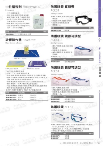 中性清洗劑 百瑞克PANREACDetergent˙中性無磷清潔液˙液狀,無磷,適用於對酸鹼物質敏感之各式玻璃.石英精密器材˙pH值:7.5(5%溶液)由陰離子及非離子界面活性劑組成˙使用濃度:2%(一般),5%(極髒)˙為生物可分解性(biodegration),沒有二次污染的問題貨號描述價格eaD9U-502601中性清洗劑 4公升/桶矽膠操作墊 HeathrowMat, Bench, silicone貨號顏色(雙面)LxWxH/mm價格eaAHW-HS120506AHW-HS120507AHW-HS120599黃/藍灰紫/灰紫藍/白350x600x2350x600x2350x600x2 AHW-HS120599AHW-HS120506AHW-HS120507˙ 由FDA食品級矽膠製成˙ 可耐121°C之高壓滅菌15分鐘˙ 防滑減震,兩面前端具攪拌子吸附條,防止攪拌子滾動˙ 適用於各種類型的實驗室和更專業的區域,如冷藏室,潔淨室,無菌室和需要高無菌性的區域˙保護檯面免受高達200℃(392℉)的熱物品的侵害˙耐化學性好,不與大多數化學品發生反應˙可在洗滌槽或洗碗機中使用標準消毒劑清洗,重複使用˙操作墊可以捲起來儲存,節省空間 註:照片中攪拌機攪拌子等配件為示意圖,需另購防護眼鏡 寛頭帶 ACESTSafety Glasses˙ 鏡片PC材質,抗紫外線,抗衝擊防霧˙橡皮鬆緊帶,無塵室可使用˙可併用近視眼鏡及口罩˙ 總重量86g貨號描述價格eaD42B-M70CVR一般防護貨號描述價格eaD42B-A10XV一般防護 藍色鏡框防護眼鏡 鏡腳可調型 ACESTSafety Glasses˙ 鏡片PC材質,抗紫外線,抗衝擊防霧˙ 軟質鼻墊,防塵遮條˙ 鼻墊,鏡腳角度,鏡腳長度皆可調整˙ 總重量38g貨號描述價格eaD42B-C30RVD42B-C30XV一般防護 紅色鏡框一般防護 藍色鏡框防護眼鏡 鏡腳可調型 ACESTSafety Glasses˙ 鏡片PC材質,抗紫外線˙ 鼻墊,鏡腳角度,鏡腳長度皆可調整˙ 軟質鼻墊,防塵遮條,可併用近視眼鏡˙ 總重量41.5g貨號描述價格eaD42B-C30FCD42B-C30F一般防護一般防護防護眼鏡 ACESTSafety Glasses˙ 鏡片/鏡框PC材質,鼻墊/上方遮條/鏡框軟墊TPR 鏡腳,Nylon 耐刮強化片,抗UV400,˙包覆式設計,上下角度三段式調整,伸縮三段式調整˙併用口罩不起霧 可併用近(遠)視眼鏡使用,F-007F工安無塵設備以上價格與規格僅供參考 , 請以實際報價為主防護眼鏡