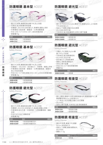 貨號描述價格eaD42B-C31XD42B-C31Z一般防護 藍色一般防護 粉色 防護眼鏡 基本型 ACEST Safety Glasses˙ 鏡片PC材質,鏡腳尾端包覆TPR,防止滑落˙ 可與近(遠)視眼鏡同時配戴˙ 防霧鏡片,抗UV400,耐刮強化片,軟鼻墊,鏡腳止滑條˙ 作業環境:切割研磨、實驗室、化學液體噴濺˙ 符合 CNS 7177/ANSI Z87.1逐批檢驗認證˙ 總重量45g貨號描述價格eaD42B-A15BD42B-A15P一般防護 藍側邊一般防護 粉側邊 防護眼鏡 基本型 ACEST Safety Glasses˙ 鏡片PC材質,鏡腳尾端包覆TPR,防止滑落˙ 防霧鏡片、抗UV400、耐刮強化片、軟鼻墊、鏡腳止滑條 ˙ 作業環境:切割研磨、實驗室、化學液體噴濺、運動休閒工作兩用眼鏡˙ 符合CNS 7177逐批檢驗/ANSI Z87.1/EN166檢驗規範˙ 總重量28g貨號描述價格eaD42B-A15GBD42B-A15GP一般防護 藍側邊灰色片一般防護 粉側邊灰色片 防護眼鏡 避光型 ACEST Safety Glasses˙ 鏡片PC材質,鏡腳尾端包覆TPR,防止滑落˙ 防霧鏡片, 抗UV400,耐刮強化片,軟鼻墊,鏡腳止滑條˙ 作業環境:遮光作業、切割研磨、化學液體噴濺、運動休閒˙ 符合CNS15067 檢驗認證˙ 總重量28g貨號描述價格eaD42B-CI30IR3D42B-CI30IR5一般防護 淺灰一般防護 深灰防護眼鏡 避光型 ACESTSafety Glasses˙鏡片IR Polycarbonate 鼻墊TPR 鏡腳Nylon 上方遮條,,,TPR 耐刮強化片,˙角度上下調整,伸縮三段式調整˙抗UV400,抗紅外線˙可併用近(遠)視眼鏡使用 併用口罩不起霧,貨號描述價格eaD42B-CI31IR5一般防護 防護眼鏡 避光型 ACEST Safety Glasses˙IR鏡片,PVC鼻樑,Nylon鏡腳,TPR上方遮條˙可併用近(遠)視眼鏡使用˙抗UV400,抗紅外線˙耐刮強化片,舒適軟鼻墊˙鏡腳止滑軟墊減壓設計˙併用口罩不起霧˙符合CNS 7177逐批檢驗規範˙重量46g貨號描述價格eaD42B-C32SD42B-C32AF一般防護 紅側邊一般防護 黑側邊防護眼鏡 輕量型 ACESTSafety Glasses˙鏡片/鏡框/鏡腳PC材質 鏡框軟墊SBR 鏡腳軟墊PVC 鏡,,,腳調整區塊Nylon 耐刮強化片,˙上下角度三段式調整,伸縮三段式調整˙抗UV400˙併用口罩不起霧 可併用近(遠)視眼鏡使用,防護眼鏡 輕量型 ACESTSafety Glasses˙鏡片PC材質,鼻墊TPR,鏡腳Nylon 耐刮強化片,˙角度上下調整,鏡腳減壓設計,抗UV400˙重量:17.5g貨號描述價格eaD42B-A18一般防護F-008F工安無塵設備以上價格與規格僅供參考 , 請以實際報價為主防護眼鏡