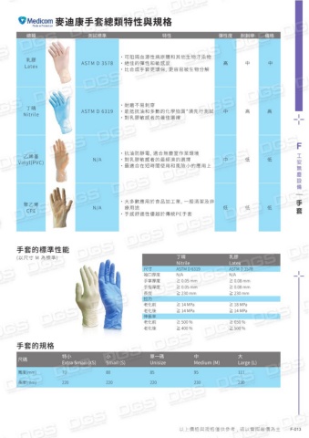 總類測試標準特性彈性度耐刺穿價格乳膠LatexASTM D 3578˙ 可阻隔血源性病原體和其他生物汙染物˙ 絕佳的彈性和敏感度˙ 比合成手套更環保, 更容易被生物分解高中 中丁晴NitrileASTM D 6319˙ 耐磨不易刺穿˙ 能抵抗油和多數的化學物質*須先行測試˙ 對乳膠敏感者的最佳選擇中高高乙烯基Vinyl(PVC)N/A˙ 抗油防靜電, 適合無塵室作業環境˙ 對乳膠敏感者的最經濟的選擇 ˙ 最適合在短時間使用和風險小的應用上 中低低聚乙烯CPEN/A˙ 大多數應用於食品加工業, 一般清潔及非 療用途˙ 手感舒適性優越於傳統PE手套 低低低麥迪康手套總類特性與規格丁晴Nitrile乳膠Latex尺寸ASTM D 6319ASTM D 3578袖口厚度手掌厚度手指厚度長度N/A≧ 0.05 mm≧ 0.05 mm≧ 230 mmN/A≧ 0.08 mm≧ 0.08 mm≧ 230 mm拉力老化前老化後≧ 14 MPa≧ 14 MPa≧ 18 MPa≧ 14 MPa伸長率老化前老化後≧ 500 %≧ 400 %≧ 650 %≧ 500 %手套的規格尺碼特小Extra Smail (XS)小Smail (S)單一碼Unisize中Medium (M)大Large (L)寬度(mm)70808595111長度(mm)220220220230230手套的標準性能(以尺寸 M 為標準)F-013F工安無塵設備以上價格與規格僅供參考 , 請以實際報價為主手套