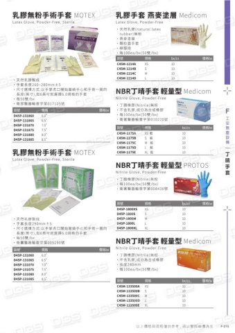 乳膠無粉手術手套 MOTEXLatex Glove, Powder-Free, Sterile貨號規格價格bxD45P-131860D45P-131865D45P-131870D45P-131875D45P-131880D45P-1318856.0\6.5\7.0\7.5\8.0\8.5\˙天然乳膠製成˙手套長度260~280mm±5˙尺寸選擇方式:以手掌虎口開始圍繞手心和手背一圈的長度(英寸),如6英吋就選擇6.0規格的手套˙ 每50雙/bx˙ 衛部醫器輸壹字第017105號乳膠無粉手術手套 MOTEXLatex Glove, Powder-Free, Sterile貨號規格價格bxD45P-131060D45P-131065D45P-131070D45P-131075D45P-131080D45P-1310856.0\6.5\7.0\7.5\8.0\8.5\˙天然乳膠製成˙手套長度290mm±5˙ 尺寸選擇方式:以手掌虎口開始圍繞手心和手背一圈的長度(英寸),如6英吋就選擇6.0規格的手套˙每50雙/bx˙衛署醫器輸壹字第005190號乳膠手套 燕麥塗層 MedicomLatex Glove, Powder-Free˙天然乳膠(natural latex rubber)無粉˙ 燕麥塗層˙ 顆粒面手套˙ 檸檬綠˙ 每100ea/bx(50雙/bx)貨號規格bx/cs價格bxC45M-1214AC45M-1214BC45M-1214CC45M-1214DXSSML10101010NBR丁晴手套 輕量型 MedicomNitrile Glove, Powder-Free˙丁腈橡膠(Nitrile)無粉˙不含乳膠,成分為合成橡膠˙ 每100ea/bx(50雙/bx)˙衛署醫器輸壹字第010220號貨號規格bx/cs 價格bxC45M-1175AC45M-1175BC45M-1175CC45M-1175DC45M-1175EXS 藍S 藍M 藍L 藍XL 藍1010101010NBR丁晴手套 輕量型 PROTOSNitrile Glove, Powder-Free˙丁腈橡膠(Nitrile)無粉˙ 每100ea/bx(50雙/bx)˙衛署醫器輸壹字第008436號貨號規格bx/cs 價格bxD45P-1800XSD45P-1800SD45P-1800MD45P-1800LD45P-1800XLXSSMLXL1010101010NBR丁晴手套 輕量型 MedicomNitrile Glove, Powder-Free˙丁腈橡膠(Nitrile)無粉˙不含乳膠,成分為合成橡膠˙長度240mm˙ 每100ea/bx(50雙/bx)貨號規格bx/cs 價格bxC45M-133500AC45M-133500BC45M-133500CC45M-133500DC45M-133500EXSSMLXL1010101010F-015F工安無塵設備以上價格與規格僅供參考 , 請以實際報價為主丁晴手套