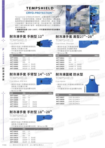 Tempshield 公司成立於1980年,主要生產個人用低溫保護服裝。可使用於液態氧、液態氫。其主要產品,是由鐵氟龍塑膠製成的實驗室器皿液態氮、液態天然氣、乾冰、低溫冷凍設備等。產品有耐冷凍手套、防水耐凍手套、耐冷凍圍裙和工業防滑耐凍手套等,都是那些在極冷的工作環境裡必要的防護設備。*建議使用溫度-160~148℃,不可直接浸泡於低溫液體內 (如液態氮)耐冷凍手套 手腕型 12\TEMPSHIELDCryo-Glove, Wrist˙適用於低溫工作環境如液態氮及液態氫,可包覆至手腕˙不可直接浸泡於低溫液體內使用˙每2ea/pr(雙)貨號規格價格prA47T-30001A47T-30002A47T-30003A47T-30004A47T-30005A47T-30006WRS 小WRM 中WRL 大WRSWP 小 防水型WRMWP 中 防水型WRLWP 大 防水型 耐冷凍手套 手臂型 14\~15\TEMPSHIELDCryo-Glove, Mid Arm˙適用於低溫工作環境如液態氮及液態氫,可包覆至手臂˙不可直接浸泡於低溫液體內使用˙每2ea/pr(雙)貨號規格價格prA47T-30007A47T-30008A47T-30009A47T-30011A47T-30012A47T-30013MAS 小MAM 中MAL 大MASWP 小 防水型 MAMWP 中 防水型 MALWP 大 防水型 耐冷凍手套 手肘型 18\~20\TEMPSHIELDCryo-Glove, Elbow˙適用於低溫工作環境如液態氮及液態氫,可包覆至手肘˙不可直接浸泡於低溫液體內使用˙每2ea/pr(雙)貨號規格價格prA47T-30015A47T-30016A47T-30017A47T-30018A47T-30019A47T-30020EBS 小EBM 中EBL 大EBSWP 小 防水型EBMWP 中 防水型EBLWP 大 防水型耐冷凍手套 肩型27\~28\TEMPSHIELDCryo-Glove, Shoulder˙適用於低溫工作環境如液態氮及液態氫,可包覆至肩膀˙不可直接浸泡於低溫液體內使用˙每2ea/pr(雙)貨號規格價格prA47T-30021A47T-30022A47T-30023A47T-30024A47T-30025A47T-30026SHS 小SHM 中SHL 大SHSWP 小 防水型SHMWP 中 防水型SHLWP 大 防水型 貨號規格價格eaA47T-30027A47T-30028A47T-30029A47T-30030CA36 36Lx24W/inCA42 42Lx24W/inCA48 48Lx24W/inCA54 54Lx24W/in耐冷凍圍裙 防水型TEMPSHIELDCryo-Apron˙適用於低溫工作環境如液態氮及液態氫˙不可直接浸泡於低溫液體內使用F-018F工安無塵設備以上價格與規格僅供參考 , 請以實際報價為主耐冷凍手套