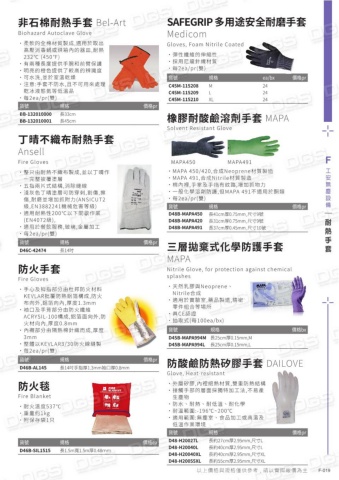 非石棉耐熱手套 Bel-ArtBiohazard Autoclave Glove˙ 柔軟的全棉材質製成,適用於取出高壓消毒鍋或烘箱內的器皿,耐熱232℃ (450℉)˙有兩種長度提供手腕和前臂保護˙ 明亮的橙色提供了較高的辨識度˙ 可水洗,並於室溫乾燥˙ 注意:手套不防水,且不可用來處理乾冰液態氮等低溫品˙每2ea/pr(雙)貨號規格價格prBB-132010000BB-132010001長33cm長45cm 丁晴不織布耐熱手套 AnsellFire Gloves˙ 整只由耐熱不織布製成,並以丁晴作一完整披覆塗層˙五指兩片式結構,消除縫線˙ 淺灰色丁晴塗層可防穿刺,割傷,擦傷,耐磨並增加抓附力(ANSICUT2級,EN3882241機械危害等級)˙ 適用耐熱性200℃以下間歇作業(EN4072級),˙ 適用於餐飲服務,玻璃,金屬加工˙每2ea/pr(雙)貨號規格價格prD46C-42474長14吋防火手套Fire Gloves˙ 手心及拇指部分由杜邦防火材料KEVLAR批覆防熱鋁箔構成,防火布向外,鋁箔向內,厚度1.3mm˙ 袖口及手背部分由防火纖維ACRYSIL-100構成,鋁箔面向外,防火材向內,厚度0.8mm˙ 內襯部分由隔熱棉針織而成,厚度3mm˙ 整體以KEVLAR3/30防火線縫製˙ 每2ea/pr(雙)貨號規格價格prD46B-AL145長14吋手指厚1.3mm袖口厚0.8mm防火毯Fire Blanket˙耐火溫度537℃˙重量約1kg˙附保存袋1只貨號規格價格eaD46B-SIL1515長1.5m寬1.5m厚0.48mmSAFEGRIP 多用途安全耐磨手套 MedicomGloves, Foam Nitrile Coated˙ 彈性纖維的伸縮性˙ 採用尼龍針織材質˙每2ea/pr(雙)貨號規格ea/bx價格prC45M-115208C45M-115209C45M-115210MLXL242424橡膠耐酸鹼溶劑手套 MAPASolvent Resistant Glove貨號規格價格prD48B-MAPA450D48B-MAPA420D48B-MAPA491長41cm厚0.75mm 尺寸9號,長31cm厚0.75mm 尺寸9號,長37cm厚0.45mm 尺寸10號,MAPA450MAPA491˙MAPA 450/420,合成Neoprene材質製造˙MAPA 491,合成Nitrile材質製造˙棉內裡,手掌及手指有紋路,增加抓物力˙一般化學溶劑防護,但MAPA 491不適用於酮類˙每2ea/pr(雙)三層拋棄式化學防護手套 MAPANitrile Glove, for protection against chemical splashes˙天然乳膠與Neoprene、Nitrile合成˙適用於實驗室,藥品製造,精密零件組合等場所˙具CE認證˙抽取式(每100ea/bx)貨號規格價格bxD45B-MAPA994MD45B-MAPA994L長25cm厚0.15mm,M長25cm厚0.15mm,L 防酸鹼防熱矽膠手套 DAILOVEGlove, Heat-resistant˙ 外層矽膠,內裡絕熱材質,雙重防熱結構˙接觸手部的層面採獨特加工法,不易產生塵物˙防水、耐熱、耐低溫、耐化學˙耐溫範圍:-196℃~200℃˙適用範圍:無塵室、食品加工或高溫及低溫作業環境貨號規格價格prD48-H20027LD48-H20040LD48-H20040XLD48-H20055XL長約27cm厚2.95mm,尺寸L長約40cm厚2.95mm,尺寸L長約40cm厚2.95mm,尺寸XL長約55cm厚2.95mm,尺寸XLF-019F工安無塵設備以上價格與規格僅供參考 , 請以實際報價為主耐熱手套