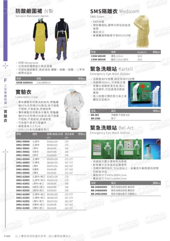 貨號規格價格eaD42B-SA56410114Lx89W/cm˙材質:Neoprene˙可用來防護輕度化學品潑濺˙可提供測試報告,測試項目:鹽酸、硝酸、硫酸、二甲苯˙綁帶式設計防酸鹼圍裙 台製Solvent Resistant Apron實驗衣Laboratory Coat˙厚布實驗衣材質為斜紋布,聚酯纖維65%天然棉35%製成,吸汗透氣不悶熱,不易起球,舒適耐穿˙薄布實驗衣材質為平織布,聚酯纖維65%天然棉35%製成,吸汗透氣不悶熱,不易起球,舒適耐穿˙ 可依客戶需求代客繡字˙誤差值為±2.5cm˙D49J-61系列為螺紋束口貨號規格胸寬x袖長x衣長 適合身高cmcm價格eaD49J-59004D49J-59000D49J-59001D49J-59002D49J-590033L厚布2L厚布L厚布M厚布S厚布63x62x10460x60x10158x58x9955x57x9653x55x93175170165160155 D49J-60004D49J-60003D49J-60002D49J-60001D49J-600003L薄布2L薄布L薄布M薄布S薄布60x59x10958x58x10555x57x10153x55x9950x53x95172-177167-172162-167157-162152-157D49J-62004D49J-62003D49J-62002D49J-62001D49J-620003L厚布+束口 63x62x1042L厚布+束口 60x60x101L厚布+束口M厚布+束口S厚布+束口58x58x9955x57x9653x55x93175170165160155D49J-61004D49J-61003D49J-61002D49J-61001D49J-610003L薄布+束口 60x59x1092L薄布+束口 58x58x105L薄布+束口M薄布+束口S薄布+束口55x57x10153x55x9950x53x95172-177167-172162-167157-162152-157SMS隔離衣 MedicomSMS Gown˙SMS材質˙頸部魔鬼粘,腰帶可綁在前面或後面˙羅紋束口˙衛署醫器陸輸壹字第001029號貨號規格ea/pk/cs價格pkC45M-W824RC45M-W842R黃色,122cm藍色,122cm,防水10/510/5 貨號描述價格eaBK-383BK-2386洗眼瓶 不含架 500架子緊急洗眼站 KartellEmergency Eye-Wash Station˙ 洗眼瓶為PE材質,固定架為PS材質˙ 洗眼瓶500mL,可填裝生理食鹽水或眼部清洗液,瓶口為洗眼杯,可迅速清洗眼部異物˙ 瓶口氣閥可預防受污染之液體回流至瓶內緊急洗眼站 Bel-ArtEmergency Eye-Wash Station貨號描述價格eaBB-248660000BB-248680000BB-248510000緊急洗眼站瓶架 單瓶用緊急洗眼站瓶架 雙瓶用緊急洗眼站配件 洗眼瓶1L˙ 快速指示圖方便使用洗眼瓶˙ 配有鏡子及多語言指導使用˙ 洗眼杯專利設計,可以在站立、坐著或平躺時提供即時的眼部沖洗˙單瓶架尺寸445x380H/mm˙雙瓶架尺寸457x349H/mmF-020F工安無塵設備以上價格與規格僅供參考 , 請以實際報價為主實驗衣