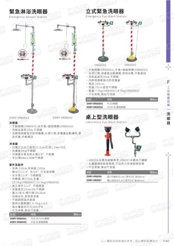 貨號規格 價格eaD9RY-VR80041D9RY-VR80042手拉 及 PUSH開關手拉 及 腳踏開關D9RY-VR80041D9RY-VR80042緊急淋浴洗眼器Emergency Shower Station洗眼器˙手動開關(VR80041)及手動+腳踏開關(VR80042)˙洗眼盆直徑30㎝,不銹鋼˙洗眼噴頭螺旋式附保護蓋,水源打開,保護蓋自動彈開,使用完畢,手動蓋回沖淋器˙凹槽式出水口直徑13.5㎝x孔徑1.2㎜x76孔˙保護蓋24㎝不銹鋼˙沖淋進水管及制水閥3/4”不銹鋼˙手拉環6㎜x130㎜不銹鋼管件及配件˙全高:230㎝,沖淋器:220㎝˙進水口11/4”及3/4”可互換接頭˙出水管11/4”不銹鋼管˙洗眼器:高110㎝,全重18.5kg(VR80041),19.5kg(VR80042)˙直立管件11/4”不銹鋼管˙底盤直徑25㎝x3孔不銹鋼˙蓄光(夜光)標示牌18x36㎝˙加裝由任,更容易安裝˙不銹鋼管拋光處理˙適用水壓範圍0.5~5kg /cm2˙進水量最高可至1002PM˙ 不含安裝,需自行安裝立式緊急洗眼器Emergency Eye-Wash StationVR80091VR80092˙手推開關(VR80091),手推+腳踏開關(VR80092)水源打開,保護蓋自動彈開,使用完畢,手動蓋回˙洗眼盆直徑30㎝,不銹鋼˙洗眼噴頭螺旋式附保護蓋˙高度:105cm˙底盤:25cm直徑不銹鋼˙重量:7.5kg(VR80091);8.5kg(VR80092)˙不含安裝,需自行安裝貨號規格價格eaD9RY-VR80091D9RY-VR80092PUSH開關PUSH 及 腳踏開關桌上型洗眼器Laboratory Eye-Wash Station貨號規格價格eaD9RY-VR8006D9RY-VR8007單口可抽取式入水口管牙3/8\雙口固定式入水口管牙3/8\˙ VR8006本體為銅製烤漆,VR8007本體為不鏽鋼˙ 水蓮蓬頭採軟質橡膠,不因用力而使眼睛受傷˙ 不含安裝,需自行安裝F-021F工安無塵設備以上價格與規格僅供參考 , 請以實際報價為主洗眼器