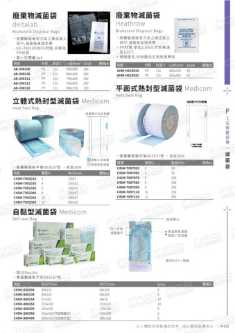 廢棄物滅菌袋 deltalabBiohazard Disposal Bags˙ 將實驗過後受污染之樣品裝入袋中,滅菌後直接丟棄˙AD-200100為PE材質,其餘為PP材質˙最小訂購量1pk貨號材質耐溫℃LxW(mm) ea/pk價格pkAD-200100AD-200310AD-200311AD-200312AD-200318PEPPPPPPPP121121121121121750x500600x300750x400750x600900x750100500300200100立體式熱封型滅菌袋 MedicomHeat Seal Bag˙ 衛署醫器製字第003637號 ˙長度30M貨號寬度inWxH/mm價格eaC45M-T092010C45M-T092020C45M-T092030C45M-T092040C45M-T092050C45M-T0920603468101275x27100x52150x52200x57250x67300x82環氧乙烷滅菌高溫蒸氣滅菌滅菌顯示位於側邊廢棄物滅菌袋 HeathrowBiohazard Disposal Bags˙ 將實驗過後受污染之樣品裝入袋中,滅菌後直接丟棄˙ PP材質,厚度2.0mil,可耐高溫至121℃˙透明度佳,印刷藍色生物危害標誌貨號材質耐溫℃LxW(mm) ea/pk價格pkAHW-HS1002AAHW-HS1002CPPPP121121660x310810x6105050平面式熱封型滅菌袋 MedicomHeat Seal Bag˙衛署醫器製字第003637號 ˙長度30M貨號寬度in寬度mm價格eaC45M-T097050C45M-T097060C45M-T097070C45M-T097080C45M-T097090C45M-T097110C45M-T0971202346810125075100150200250300 貨號外尺寸mm內尺寸mmbx/cs價格bxC45M-880054C45M-880104C45M-880154C45M-880254C45M-880304C45M-880354C45M-88040489x13389x22957x102133x254191x330254x356(可放隔離衣)305x432(可放植牙盒)69x10669x20338x76113x227170x301234x330286x332561010555自黏型滅菌袋 MedicomSelf seal Bag內/外部滅菌指示姆指開口高溫蒸氣滅菌環氧乙烷滅菌寬型封口 + 摺線˙ 每200ea/bx˙衛署醫器製字第003637號F-023F工安無塵設備以上價格與規格僅供參考 , 請以實際報價為主滅菌袋
