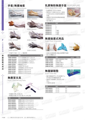 D4BK-CST001D4BK-GLT003D4BK-GLT004D4BK-GIE002D4BK-GPE001D4BK-GPE002手套/無塵袖套Super Clean Sleeve/Gloves˙手套尺寸有S、M、L 3種規格D4BK-GN09001D4BK-GR09001貨號規格價格D4BK-GN09001D4BK-GN12001D4BK-GR09001D4BK-GR12001D4BK-CST001D4BK-GPE001D4BK-GPE002D4BK-GLT003D4BK-GLT004D4BK-GIE002Nitrile 耐弱酸鹼手套 9\ 100ea/pkNitrile 耐弱酸鹼手套 12\ 100ea/pk乳膠手套指部壓紋9\ 1000ea/cs乳膠手套指部壓紋12\ 1000ea/cs無塵袖套 2ea/pk抗靜電手套 20ea/pk抗靜電顆粒止滑手套 20ea/pk無塵掌面PU手套 20ea/pk無塵指尖PU手套 20ea/pk導電指尖PU手套 20ea/pk ˙ 無塵影印紙,250張/包˙ 無塵影印紙,A3:5包/箱;A4:10包/箱貨號規格價格D4CK-AA3001D4CK-AA4001D4CK-AKI0011D4CK-AKI0012D4CK-AKI0013D4CK-ACT0043無塵影印紙A3 279mmx420mm無塵影印紙A4 210mmx297mm清潔滾輪W20cmxL20M 5ea/pk清潔滾輪W30cmxL20M 5ea/pk清潔滾輪W45cmxL20M 5ea/pk無塵筆記本 A4 橫條/活頁式,10本/pk 無塵室文具Super Clean Writing Tools乳膠無粉無塵手套 SUPERPUREGlove, Super Pure, Latex˙乳膠製成,分左右手兩包˙ 無粉加工,經過16MΩ以上超純水清潔,並在100級的無塵室內包裝˙滅菌款手套採用伽瑪射線滅菌˙全長約305mm˙每50雙/bx貨號規格價格bxAO6906-01AO6906-02AO6906-03AO6906-51AO6906-52AO6906-53LMSL 滅菌M 滅菌S 滅菌無塵拋棄式用品Super Clean Disposable貨號規格ea/pk價格pkD4AK-HAN001D4BK-CTS001D4BK-GFT001D4BK-GFT002D4BK-GFT003拋棄式無塵網帽20\雙筋拋棄式鞋套抗靜電手指套 S抗靜電手指套 M抗靜電手指套 L100100144014401440 ˙拋棄式無塵網帽,鞋套,抗靜電手指套˙ 最小訂購量1pk無塵腳踏墊Super Clean Mat˙置於實驗室門口,可沾黏鞋子上的灰塵,保持實驗室乾淨˙適用於多種場所,如住家,診所…門口˙不適用在推車貨號描述ea/cs價格csD4CK-MAT01D4CK-MAT04D4CK-MAT0618\x45\24\x36\26\x45\300300300F-026F工安無塵設備以上價格與規格僅供參考 , 請以實際報價為主無塵拋棄式用品