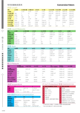 單位µm 微米mm 豪米/公釐cm 釐米/公分m 米/公尺km 公里in.(inch) 英吋ft.(foot) 英呎yd.(yard)碼mi.(mile)英哩µm 微米11 x 10-31 x 10-41 x 10-61 x 10-93.937 x 10-53.281 x 10-61.094 x 10-66.214 x10-10mm 豪米/公釐100010.10.0011 x 10-63.937 x 10-23.281 x 10-31.094 x 10-36.214 x 10-7cm 釐米/公分100001010.011 x 10-50.3937 3.281 x 10-21.094 x 10-26.214 x 10-6m 米/公尺 1 x 106100010010.00139.373.2811.09366.214 x 10-4km 公里1 x 1091 x 1061 x 105100013937032801093.60.6214in.(inch) 英吋2540025.42.542.54 x 10-22.54 x 10-518.333 x 10-22.778 x 10-21.578 x 10-5ft.(foot) 英呎3.048 x 105304.830.480.30483.048 x 10-41210.333331.894 x 10-4yd.(yard)碼9.144 x 105914.491.440.91449.144 x 10-436315.682 x 10-4mi.(mile)英哩1.609 x 1091.609 x 1061.609 x 1051609.351.6093563360528017601常用度量衡換算表 Conversion Fators長度 Length液量 Liquid Measures單位µL 微升mL 豪升/公撮L 升/公升 Dram特拉姆Oz.盎司Qt.夸特Gal加崙µL 微升11 x 10-31 x 10-62.705 x 10-43.3814 x 10-51.0566 x 10-62.642 x 10-7mL 豪升/公撮100011 x 10-30.27053.3814 x 10-21.0566 x 10-32.642 x 10-4L 升/公升 1 x 10610001270.512133.8141.05660.2642Dram特拉姆1 x 1091 x 1061 x 10510.1253.906 x 10-39.765 x 10-4Oz.盎司2.9753x 10529.5742.957 x 10-2813.125 x 10-27.8125 x 10-3Qt.夸特9.4635 x 106946.35290.946352563210.25Gal加崙3.7854 x 1073784.43.7854102412841單位mg 豪克g 克/公克kg 公斤T 噸/公噸gr grainOz.盎司lb. 磅mg 豪克11 x 10-31 x 10-61 x 10-91.5432 x 10-23.5274 x 10-52.205 x 10-6g 克/公克100011 x 10-31 x 10-615.43243.5274 x 10-22.204 x 10-3kg 公斤 1 x 106100011 x 10-31.5432x 10435.27392.204T 噸/公噸1 x 1091 x 1061 x 10311.5432 x 1083.5273 x 1052204.6226gr grain64.79896.4799 x 10-26.4799 x 10-56.4799 x 10-812.2857 x 10-31.4286 x 10-4Oz.盎司2.8349 x 10528.34952.834 x 10-22.835 x 10-5437.510.0625lb. 磅4.5359 x 106453.59230.45364.5359 x 10-47000161重量 Mass單位torr托爾mmHg豪米汞柱inHg英寸汞柱mbar 豪巴 kpa 千帕psi(lb.f/in 磅/英吋 )22kg.f/cm2 公斤/釐米2 atm 大氣壓torr托爾(mmHg豪米汞柱)13.937 x 10-21.33320.13331.9336 x 10-21.3595 x 10-31.3158 x 10-3inHg英寸汞柱25.4133.86383.38630.49123.4531 x 10-23.3421 x 10-2mbar 豪巴 0.752.953 x 10-210.11.4503 x 10-21.0197 x 10-39.8692 x 10-4kpa 千帕7.50.29531010.14501.0197 x 10-29.8692 x 10-3psi (lb.f/in 磅/英吋 )2 251.71492.03668.94756.897417.0306 x 10-26.8046 x 10-2kg.f/cm 公斤/釐米22735.559228.9591980.66598.066514.223310.9678atm 大氣壓76029.921013.25101.32514.6961.03321壓力 Pressure單位℃℉K℃ 攝氏℃1.8x℃+32℃+273.15℉ 華氏0.556 x ℉-17.8℉0.556 x ℉+255.3K K-273.151.8 x K-459.4K溫度Temperature濃度單位ppmppbppt科學數量級10-610-910-12英文名稱Parts Per MillionParts Per billionParts Per tillion中文名稱百萬分之一十億分之一萬億分之一用於容量表示1mg/1L1µg/1L1ng/1L用於質量表示1mg/1Kg1µg/1Kg, 1mg/T1ng/1Kg, 1µg/T相對濃度Relative concentration第一位數字:對固體物進入的防護第二位數子:防水保護**-0無防護 -0無防護 -1直徑 > 50mm -1垂直落下水滴防護-2直徑 > 12.5mm -2傾斜15 度時垂直落下水滴防護-3直徑 > 2.5mm -3防護濺出的水, 以 60 度角濺出-4直徑 > 1mm -4防護噴水, 任何方向潑灑-5防護灰塵 *-5防護射水, 任何方向水柱-6灰塵封閉 , 20毫巴低壓時不應進入-6防護強射水, 任何方向強水柱-7防護短時浸水 (水深一米,30min)-8防護長期浸水 (特定條件需標明)*不可能完全阻止灰塵進入,但灰塵進入的數量不會對設備造成傷害**符合7,8防水保護, 並不一定符合5,6防水保護IP (Int'l Protection) 等級 EN60529/IEC529G-002G附錄/貨號索引常用度量衡換算表